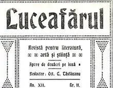 In 1902, Tăslăuanu was named a secretary at the Romanian consulate in Budapest.[6] Somewhat unusually for a member of the country's diplomatic service, he did not hold Romanian citizenship at the time.[7] While there, he edited and corrected articles for Luceafărul, as well as writing original work, and began a close friendship with Octavian Goga, for whom he managed to create an environment that fostered Goga's poetic creativity. The following year, he became head editor at the magazine, which due to his initiative emerged as a voice for younger writers, in particular Goga, then reaching the peak of his creativity.[6] By 1904, he was owner as well as editor of Luceafărul. In 1905, he attended celebrations at Sibiu marking the opening of the ASTRA Museum. There, he met Adelina Olteanu, the sister of officer Marcel Olteanu.[8][9] Adelina was a former Luceafărul contributor whom Goga intended to marry. She and Tăslăuanu fell in love and became engaged, marking the first break with Goga. On June 17, 1906, the couple married, and that year, he moved the Luceafărul headquarters from Budapest to Sibiu, the first issue appearing there in October. Also that autumn, he became administrative secretary of ASTRA,[9] as well as signing a contract stipulating Goga would be director of Luceafărul and Tăslăuanu editor-in-chief.[10]
