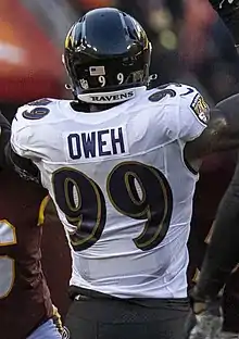 Odafe Jayson Oweh (/əˈdɑːfeɪ ˈoʊweɪ/; born December 15, 1998), formerly known as Jayson Oweh, is an American football outside linebacker for the Baltimore Ravens of the National Football League (NFL). He played college football at Penn State and was drafted by the Ravens in the first round of the 2021 NFL Draft.