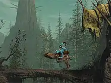 Throughout the game, Abe is attacked by Sligs, Slogs, Scrabs, and Paramites, and Bats. Sligs will shoot on sight, but cannot see through dark areas; Slogs will bark loudly if they hear the player, and will chase them without regard for anything else. Scrabs will attack anything in their territory, including others of their own kind, while Paramites will attack when in packs or when cornered and are docile otherwise. Bats are enemies that occasionally appear, flying erratically in a small area, usually with other bats, and they can be killed with rocks.[8][9] Elums are bipedal creatures that Abe can ride and communicate with by GameSpeak, although they will be distracted by dripping honey. Late in the game, Abe gains the ability to transform into a demigod called 'Shrykull', which can eviscerate all on-screen enemies. Abe can gain a limited number of transformation uses after rescuing enough Mudokons at the same time.[10] The traits of these creatures are often used to create puzzles, where you must take note of each creature's strengths and weaknesses, and take advantage of them in order to survive.