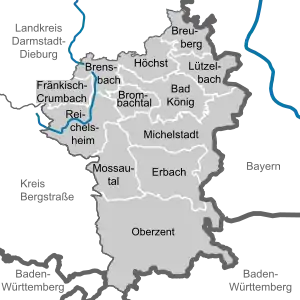 The Odenwaldkreis is a Kreis (district) in the south of Hesse, Germany. Neighboring districts are Darmstadt-Dieburg, Miltenberg, Neckar-Odenwald-Kreis, Rhein-Neckar-Kreis and Kreis Bergstraße. Odenwaldkreis belongs to the Rhine Neckar Area.