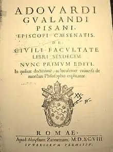 From 1557 till 1588 he was Bishop of Cesena in northern Italy.[5] In that capacity Gualandi organized several synods. The synod in 1582 resulted in his first publication, Constitutiones, et decreta condita ab illustri...Adoardo Gualando...Caesenae. 1584. In 1588 Gualandi retired and was succeeded as Bishop of Cesena by his nephew Camillo Gualandi.