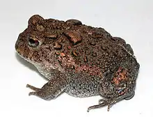 Males measure 50–60 mm (2.0–2.4 in) and females 45–70 mm (1.8–2.8 in) in snout–vent length. The snout is vertical in profile. The parotoid glands are large and ovoid. Dorsal ground colour is greyish green. The male advertisement call is composed of a single, multi-pulsed note.[3]