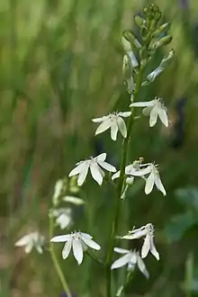 Odontostomum is a monotypic genus of flowering plants containing the single species Odontostomum hartwegii, which is known by the common name Hartweg's doll's-lily. In the APG III classification system, it is placed in the family Tecophilaeaceae.[1] It was formerly placed in the Liliaceae. It This wildflower is endemic to northern California, where it can be found in the inner coastal mountain ranges and the Sierra Nevada foothills. It grows in rocky clay and often serpentine soils in grassland and woodland habitat, sometimes near vernal pools. This is a perennial herb growing from an oval-shaped corm up to 3 centimeters wide deep in the soil. The curving, widely branching stem is up to about half a meter in maximum height with linear leaves up to 30 centimeters long sheathing the lower portion. The inflorescence is a raceme or panicle of several flowers on pedicels. Each flower has six white or yellowish tepals, the lower parts fused into a veined tube and the tips spreading and then becoming reflexed. At the center of the flower are six stamens and six staminodes in a ring around the gynoecium.