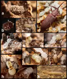 | Inquilines of Odontotermes formosanus. (a) Cycloxenus sp. (Coleoptera: Cerylonidae), adult in dorsal view; (b) Cycloxenus sp., adult in ventral view; (c) larva of Cycloxenus sp.; (d) Ziaelas formosanus (Coleoptera: Tenebrionidae); (e) Clitelloxenia audreyae (Diptera: Phoridae); (f) Clitelloxenia formosana (Diptera: Phoridae); (g) Selenophora shimaidai (Diptera: Phoridae); (h) Pseudotermitoxenia nitobei (Diptera: Phoridae); (i) Horologiphora sinensis (Diptera: Phoridae); (j) Platystylea sp. (Thysanura: Nicoletiidae); (k) millipede (Diplopoda: Polydesmida: Pyrgodesmidae). | |