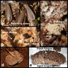A colony of Odontotermes formosanus consists of a number of large and small chambers forming the nest, linked by a complex of galleries; the queen is housed in one large chamber, and the main fungus comb occupies another, and there are several subsidiary fungus comb chambers nearby.[4]