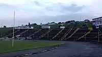 During the Second World War, the lower floor of the clubhouse was also used as an Air Raid Precautions centre, and one of the dressing rooms was the map room.[8] On 20 December 1947, the largest ever attendance for an international test at Odsal was set when 42,685 saw England defeat New Zealand 25–9. The first floodlit rugby match in the North of England was held at Odsal in 1951.[9] In September 1951, Council Engineer Ernest Wardley drew up a plan for a 92,000 capacity 'European' style stadium, at a cost of £250,000.[10] Eventually £50,000 was spent on terracing the Rooley Avenue end in 1964, before the Wardley plan was officially dropped the following year.[10]