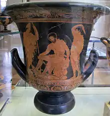 The A-side scene on the belly of the kalyx-krater depicts Homer's story of Odysseus's visit to the Underworld to consult the dead seer Teiresias. This meeting is known as a nekuomanteion or "consultation with the dead".[4]