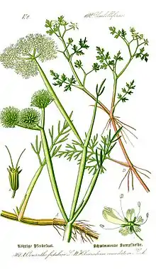 The scientific name for tubular water-dropwort was coined by Peter Artedi, who developed the modern binomial classification system, and defined the species on the basis of its involucral characters.[3] It was published after Artedi's death by Linnaeus in Species Plantarum, in 1753, and that name still stands, although numerous others (synonyms) have been proposed over the years, including Phellandrium fistulosum (L.) Clairv. (1811), O. filipendula Dumort. (1827) and Selinum fistulosum (L.) E.H.L. Krause (1904). A full list can be found in the Synonymic Checklists of the Plants of the World.[4]