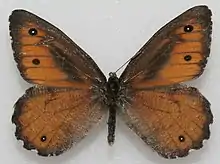 The wingspan of the great Arctic measures 2 to 2.5 inches (5.1 to 6.3 cm), making it the largest western Arctic.[4] O. n. nevadensis is bright orange brown on the upper side of the wings. The dark brown wing margins are scalloped. Males have one to two black eyespots on the forewing; females have two to three.[3] Males have a large, dark patch of sex scales on the forewing, extending from the basal area to near the apex.[2][3] Females have dark scaling on the basal area of the forewing. Both sexes have a small eyespot near the hindwing tornus. The underside of the forewing is similar to the upper side.[2][3] The ventral hindwing is uniformly striated dark brown and gray. Some populations have an irregular dark median band on the hindwing.[4] The costa is whitish. O. n. gigas is slightly larger and darker than the nominate subspecies. O. n. iduna differs from the other two subspecies in having a much paler upperside.[2][3]