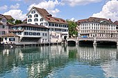 The so-called Gedecktes Brüggli served as a pedestrian bridge, was very popular, but was broken in 1950.[6] As its Swiss-German name explains, it was a covered wooden bridge that was created by architect Vögtlin over an arm of the Limmat river in 1689. Measuring about 17.5 meters in length, it connected the lower Mühlesteg and Papierwerd between present Limmatquai and Bahnhofquai nearby Bahnhofbrücke Zürich. At the site of the then mill lower ridge at Papierwerd – a former river island that later was used as the site of a paper mill – the today's Mühlesteg pedestrian bridge was erected.