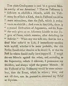 Hume starts by telling the reader that he believes that he has "discovered an argument ... which, if just, will, with the wise and learned, be an everlasting check to all kinds of superstitious delusion".[8]