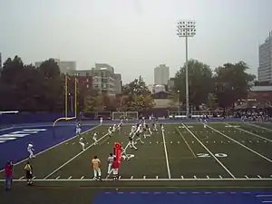 In CFL football, the replay official is not located at the stadium, rather at the CFL Command Centre at the CFL Head Office in Toronto.[5] The official is responsible for the final determination of challenges made by the two teams' head coaches; and in the final 3 minutes (and all of overtime) of the game initiating a review of any play they believe warrants such attention. The official also reviews all scoring plays during the game. When a review is underway, the referee speaks to the replay official via headset at the sideline. The replay official has the final call over all challenges and reviews.[4]