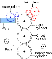 Offset printing is a common printing technique in which the inked image is transferred (or "offset") from a plate to a rubber blanket and then to the printing surface. When used in combination with the lithographic process, which is based on the repulsion of oil and water, the offset technique employs a flat (planographic) image carrier. Ink rollers transfer ink to the image areas of the image carrier, while a water roller applies a water-based film to the non-image areas.