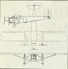 Both the rectangular cross-section fuselage and tail had welded Cr/Mo steel tubes structures and were fabric covered. The 13 ft (4.0 m) cabin accommodated six including a crew of one or two in the front row of side-by-side seats. The control column was of the throw-over type so it could be flown from either side. Alternatively, a fifth passenger could sit beside the pilot. The main landing wheels were equipped with differential brakes; a single settable lever between the front seat applied the required braking resistance but when the rudder pedal were operated the resistance was applied differentially. Cabin entry was by an angular door at the rear, where there was also a toilet. The tail surfaces were conventional with a triangular fin and tailplane, the latter mounted on top of the fuselage. The control surfaces were trapezoidal.[1][2]