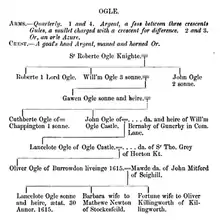 The Ogle family were prominent landed gentry in Northumberland, England. The earliest appearances of the family name were written Hoggel, Oggehill, Ogille and Oghill.[1]