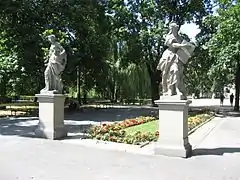 - Sandstone statues, a part of the rich collection of sculptures removed to Saint Petersburg after recapturing the city by Marshal Suvorov in 1794, and placed in the Summer Garden.[5] According to the 1745 plan of the Saxon Garden there were 70 postuments in the Garden, and in 1797 there were only 37 sculptures left;[5] only 20 of them have been preserved until our times. Four of these sculptures were completely destroyed during the blowing up of the Saxon Palace in 1944, but they were later reconstructed.[5] Included are groups of sculptures, including Arithmetic, Astronomy, Bacchus, Flora, Geography, two sculptures identified as Glory, Instruct, Intelligence, Intellect, Justice, Medicine, Military Architecture, Painting, Poetry, Rationality, Science, Sculpture, Venus and Winter. They were generally made before 1745 by anonymous Warsaw sculptors under the direction of Johann Georg Plersch.[5]