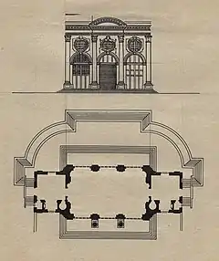 - The Great Salon, situated on the axis in the center of a Saxon Garden, was intended simply to provide a suitable end to the main garden axis. It was constructed after 1720 according to Matthäus Daniel Pöppelmann's design.[3] The building was opened to the garden by semicircular porte-fenêtres and oculi. A terrace above the ground level of the building was enclosed by an attic decorated with vases; also, two outhouses from both sides were added. The Great Salon was demolished in 1817.[5]