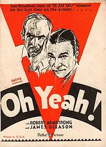 Oh, Yeah! (also written as Oh, Yeah?) is a 1929 American action film directed by Tay Garnett and starring Robert Armstrong, James Gleason and Zasu Pitts. The film's sets were designed by the art director Edward C. Jewell. An early sound film, it was made during the transition from the silent era. It is also known by the alternative title No Brakes after the original story it is based on that appeared in The Saturday Evening Post.[1]