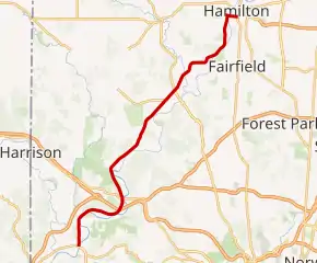 On the northeast side of Ross the road has an interchange with US 27, this interchange is the eastern end of SR 126 concurrency. The routes leaves Ross passing through woodland and farmland. The highway curves due north heading towards Hamilton. As the road enters Hamilton it passes through residential properties, before turning due east, crossing over the Great Miami River on the Columbia Bridge. After crossing the river the highway heads into another residential neighborhood along Pershing Avenue. The highway ends at US 127.[4][5][7]