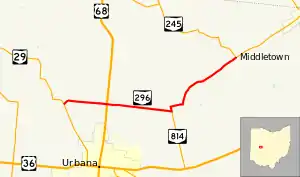 SR 296 begins at an unsignalized T-intersection with SR 29 in southern Salem Township in central Champaign County. The route initially travels northeast but curves south-southeast soon after it begins. The route crosses a railroad at-grade and then reaches US 68 at a four-way intersection. After the US 68 junction, the road continues further east before reaching a skewed T-intersection at Ludlow Road. Here, SR 296 turns left onto Ludlow Road while the short SR 814 begins to the right. SR 296 remains on Ludlow Road for a short time; it almost immediately turns right onto Urbana Woodstock Pike; soon after this intersection, it makes one last turn left to the north. Before this point, the road stayed on level ground but here, the road begins to ascend small hills. Traveling in a northeasterly direction through Wayne Township, SR 296 reaches its eastern terminus at SR 245 in the community of Middletown.[3]