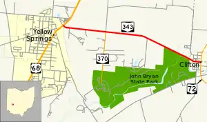 SR 343 commences from a signalized intersection with US 68 in Yellow Springs. SR 343 generally traverses a rural backdrop through Miami Township, Greene County with a mix of woods and open fields, and the occasional house along the way. About one mile (1.6 km) east of US 68, SR 343 meets SR 370, the primary access route to John Bryan State Park, at its northern terminus. SR 343 continues east, then starts to trend southeasterly, brushing the northeastern portion of John Bryan State Park just prior to entering into Clifton. Upon crossing into Clifton, SR 343 briefly ducks into Clark County, but re-enters Greene County, as it turns easterly, following North Street through the village prior to coming to an end at a T-intersection with SR 72.[2]