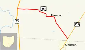 The state highway begins at an unsignalized intersection with the divided US 23 in Pickaway Township. The two-lane road travels east through farmland though there are two S-curves that bring the route further south. In the unincorporated community of Elmwood, the road passes over a railroad via a bridge. After the railroad bridge, SR 361 curves to the southeast and passes through more farmland before ending at a skewed T-intersection with SR 159 about 0.2 miles (0.32 km) north of the Pickaway-Ross County line and the village of Kingston.[2]