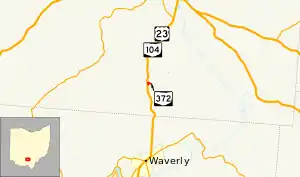 State Route 372 (SR 372) is a very short, two-lane east–west state highway in the southern part of the U.S. state of Ohio. The western terminus of this spur route is at a T-intersection with the concurrency of U.S. Route 23 (US 23) and SR 104 about six and a half miles (10.5 km) north of Waverly. Its eastern terminus is just 0.68 miles (1.09 km) to the east of that point at the boundary of Scioto Trail State Forest. Continuing east of that point is Stoney Creek Road, which traverses through the state forest in the direction of the Scioto River. From its inception in the middle of the 1930s, the primary function of SR 372 has been to provide access to the state forest from the state highway system.