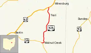 SR 515 begins its 5.5-mile-long (8.9 km) journey at a signalized intersection with SR 39 in Walnut Creek. SR 515 heads easterly through the heart of this town, passing a number of business that tie in with the local Amish culture, and serve a number of tourists throughout the travel season. At the Walnut Creek Township Highway 444 intersection, SR 515 turns north and enters into rural territory. Passing a small clump of woods before entering into open farmland predominantly composed of Amish farms, the state highway passes Township Highway 406. SR 515 abuts the east side of a forest prior to passing through a northeasterly S-curve, and re-entering a landscape of farmland as it intersects County Road 172 and Township Highway 410 successively. Turning to the northeast, SR 515 next meets County Road 168, then bends back to the north, passing amid a small patch of woods prior to intersecting Township Road 415. After a few twists and turns, SR 515 descends the hill into a little valley and passes through the tiny village of Trail. Named for this section of SR 515 that was once an old Indian trail that ran through the area, and tiny enough to lack a ZIP code, Trail is now known for its famous "Troyers Trail Bologna," a regional staple of picnics and potlucks.[3] Transitioning back into farmland, SR 515 next passes Township Road 414, and amid a blend of homes, farms and woods, curves to the northwest and then back to the northeast prior to coming to an end at its junction with US 62 at a T-intersection in Paint Township approximately one mile (1.6 km) southwest of the community of Winesburg.[4]