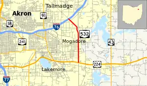 State Route 532 (SR 532) is a north–south state highway in the northeastern portion of the U.S. state of Ohio. The highway runs from its southern terminus at a signalized intersection with U.S. Route 224 (US 224) on the Summit–Portage county line approximately 0.75 miles (1.21 km) south of Mogadore on the border of Springfield Township and Suffield Township to its northern terminus at a diamond interchange with Interstate 76 (I-76), at its exit 29 within the Tallmadge city limits.