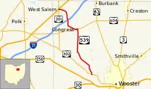 State Route 539 (SR 539) is a north–south state highway in the northeastern quadrant of the U.S. state of Ohio. State Route 539 has its southern terminus at State Route 302 in Chester Township approximately 3 miles (4.8 km) northwest of the city limits of Wooster. Its northern terminus is at its junction with State Route 301 in West Salem, just one block south of that route's junction with U.S. Route 42.