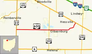 State Route 600 (SR 600) is an east–west state highway in the northwestern portion of the U.S. state of Ohio. The western terminus of State Route 600 is at US 23 about 5 miles (8.0 km) west of Gibsonburg. Its eastern terminus is at US 20 in the unincorporated community of Hessville approximately 4.25 miles (6.84 km) east of Gibsonburg.