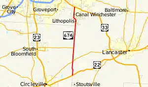 State Route 674 (SR 674) is a state highway located southeast of Columbus, Ohio. Most of the route straddles a county line; about 11 miles (18 km) of the southern part of route is on the Pickaway–Fairfield County line while the next 1.4 miles (2.3 km) is on the Fairfield-Franklin County line. The route's southern terminus is at US 22 just north of Stoutsville while the northern terminus is at an interchange with US 33 in the city of Canal Winchester.