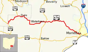 State Route 676 (SR 676) is a 26.53-mile (42.70 km) long east–west state highway in the southeastern portion of the U.S. state of Ohio. The western terminus of SR 676 is at a T-intersection with SR 555 approximately 3 miles (4.8 km) southeast of the village of Chesterhill. Its eastern terminus is at a T-intersection with SR 7 in the southwestern portion of the city of Marietta.