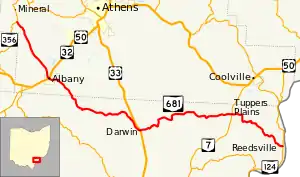 State Route 681 (SR 681) is a 39.53-mile (63.62 km) long east–west state highway in the southern portion of the U.S. state of Ohio. The western terminus of SR 681 is at a T-intersection with SR 356 approximately 6.75 miles (10.86 km) northwest of Albany. Its eastern terminus is also at a T-intersection, this time with SR 124 nearly 9.50 miles (15.29 km) southeast of Coolville.