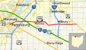 State Route 795 (SR 795) is an east–west state highway in northwestern Ohio, a U.S. state. The western terminus of SR 795 is at US 20 in Perrysburg, at the signalized intersection that doubles as the northern terminus of SR 199. Its eastern terminus is at a signalized intersection with SR 51 about 0.5 miles (0.80 km) southeast of Millbury.