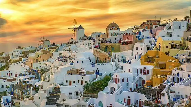 One of the most popular attractions in the town is sunset viewing. It is a special event every evening in Oia from the Sunset Seranade point. At this time the town is crowded with people to watch the spectacle, when the white houses and the caldera catch all the colours of the setting sun for a few seconds.[6]