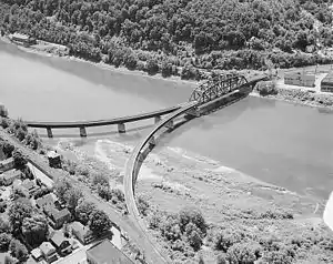 The Oil City Pennsylvania Railroad Bridge is a truss bridge that carries the Western New York and Pennsylvania Railroad (WNY&P) across the Allegheny River between Cranberry Township and Oil City, Pennsylvania. The bridge was originally built to serve the Pennsylvania Railroad as part of its Buffalo Line. WNY&P is the fourth owner of the structure. After the breakup of the Pennsy, Conrail took ownership of the line. The breakup of these company saw Norfolk Southern assigned the rights; the WNY&P took ownership in 2006 as they extended their trackage from Meadville, Pennsylvania to Oil City.[1] Because the bridge once served as a major junction point for several Pennsylvania Railroad lines, it features a unique approach structure. One section went from Oil City through Tidioute, Pennsylvania and then on to Warren, Pennsylvania. This line was operated until 1976. It was removed in the early 1980s.
