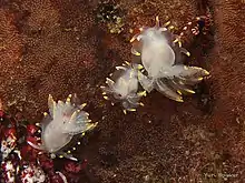 | The nudibranchs Okenia luna on their food bryozoan. | |