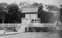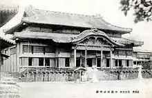 ![]() Okinawa Shrine haiden, formerly the main hall of Shuri Castle, before the Battle of Okinawa; visible in the photo are the shrine temizuya, tōrō, shimenawa, and offering box[1] | |