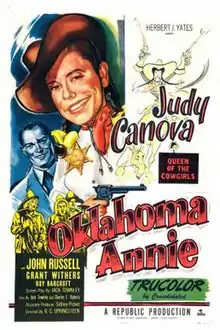 Oklahoma Annie is a 1952 American Western film directed by R. G. Springsteen and written by Jack Townley and Charles E. Roberts. The film stars Judy Canova, John Russell, Grant Withers, Roy Barcroft, Emmett Lynn and Frank Ferguson. The film was released on March 24, 1952 by Republic Pictures.[1][2][3]
