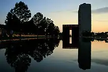 - Reflecting Pool: A thin layer of water flows over polished black granite to form the pool, which runs east to west down the center of the Memorial (also see reflecting pool) on what was once Fifth Street. Although the pool is flowing, visitors are able to see a mirror image of themselves in the water. Visitors seeing their reflections are said to be seeing "someone changed forever by what happened here."[1][6]