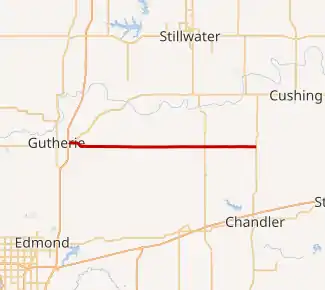 The highway begins at State Highway 33 just east of Guthrie, just east of Interstate 35. It heads due east from here, passing just north of the northernmost tip of Country Club Lake. Just after this lake, the highway turns southeast, then back to the east, bringing it onto the section line that it will follow for the remainder of its route. The highway crosses the Indian Meridian north of the town of Meridian.[4] The highway continues east, crossing from Logan into Lincoln County.