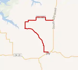 SH-127 begins in downtown Jay at the intersection of South Main Street (US-59/SH-10/SH-20) and South 5th Street. From this point, SH-127 eastbound proceeds north along South 5th Street to Cherokee Street, where it turns west. It turns back to the north along North 14th Street, which it follows out of Jay.[2] Eastbound SH-127 then turns northwest, passing through a landform known as Muskrat Hollow. The highway then turns to the north, emerging into Courthouse Prairie. It makes a sharp turn to the east, and then to the north, before reaching Zena. It heads generally east from Zena, with four sharp curves between the unincorporated place and the highway's eastern terminus. SH-127 ends at US-59/SH-10 between Jay and Grove.[3] While SH-127 is just over 13 miles (21 km) long, the distance between its two termini along US-59/SH-10 is only 5.6 miles (9.0 km).[1][4]