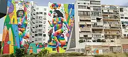In 2017, Okuda was named among the most recognized contemporary urban artists by Graffiti Art Magazine.[15] His outdoor works appear in Spain, Morocco, Miami, Paris, Edmonton, Vancouver, and Toronto.[3][4][5][6][8] His tallest outdoor mural is a multithemed painting on a 23-story student residence in Toronto completed in 2018.[8]