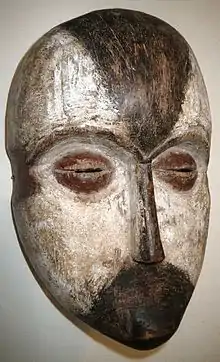 The Okuyi (plural: Mekuyo, also known as Ukuyi, Ocuya, Mokoi, Mukudj, Ikwara, Okukwe and Mbwanda, in Equatorial Guinea (Spanish): Mamarracho[1]) is a rite of passage practised by several Bantu ethnic groups in different countries mainly across the west coast of Central Africa. Some of the countries where the rite is exercised include Cameroon in West Central Africa, Gabon and Equatorial Guinea. Traditionally, the rite is performed at numerous special occasions including funerals and weddings. Usually when an infant reaches four months of age or when a child becomes an adolescent, an Okuyi ritual is applied as well. Today, the Mekuyo rite is exercised by a range of ethnic peoples within the Bantu cluster. The coastal community known as Ndowe, also known as playeros, is a primary example, as peoples across Equatorial Guinea frequently perform the ritual in public.[2] Gabon has two chief ethnic groups that exercise the Okuyi rite including the Mpongwe and Galwa from Lambaréné, Gabon. The man in the custome is usually the leader of the group.