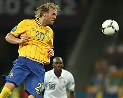 On 21 August 2007, he scored a hat trick (including two penalties) for Sweden U21 against Wales U21 in a 4–3 friendly defeat.[49] He was a member of the U-21 national team at the 2009 European Championship in Sweden and scored three times in the competition against Italy U21,[50] Serbia U21,[51] and a superb freekick against England U21 which contributed to a comeback from 3–0 down to 3–3 with Toivonen scoring the second goal.[52]