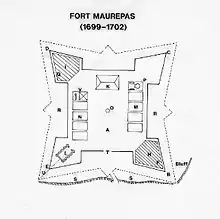 The name Biloxi in French was spelled Bilocci, in a transliteration of the name of the local Native American tribe. The military camp was also known in French as Fort Maurepas to honor Louis Phélypeaux, comte de Maurepas from the city of Maurepas.[3] It appeared as "Fort Bilocci" on English maps updated circa the years 1710/1725.[4][5]