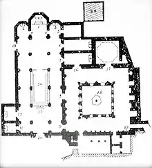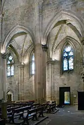In the parts that today are still standing, the Romanesque origins are visible, although sometimes the solutions used were close to proto-Gothic. It responded to the type of Romanesque church with three naves, with a larger central apse and two smaller ones on the sides, although currently there are three naves without any apse. The highest central nave maintains its original ribbed vaults with tiercerons and simple in the aisles.