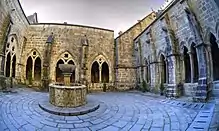 The cloister, of irregular plant, is of evident transition from Romanesque to Gothic, typical of the ancient Cathedral. Reminiscence of the Romanesque in its columns and capitals, with biblical scenes, and references to the Gothic in the arches and ribbed vaults. The west and south naves are of clear Cistercian style. The center of the courtyard is occupied by a Gothic fountain from the 15th century, with coats of arms of the bishop and cardinal Juan de Carvajal.