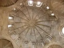 It is a room with a square floor, which becomes an octagon through ribbed tubes that make up a foiled vault of sixteen nerves. On the outside, the double canopy dome is a steep and conical element, covered with laves in the form of scales, which hinder the erosion that rainwater can produce. At the highest point it ends with a fluted ball, which has given rise to the popular name of Torre del Melón.